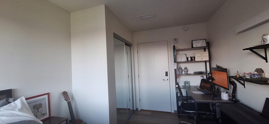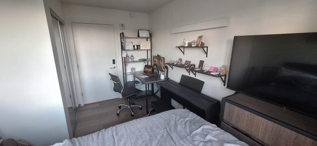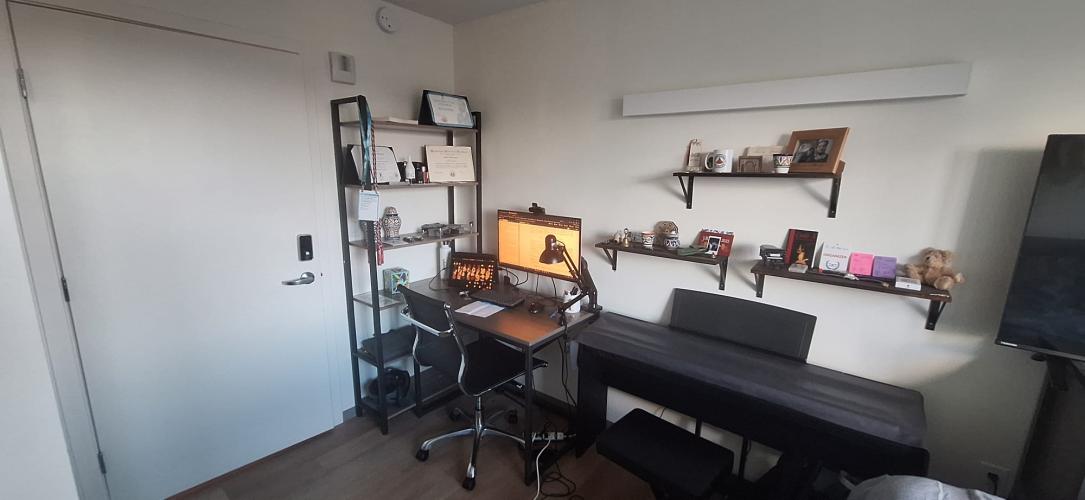 - The unit is fully furnished: Fully equipped kitchen and living room. Room includes desk and monitor, as well as piano.