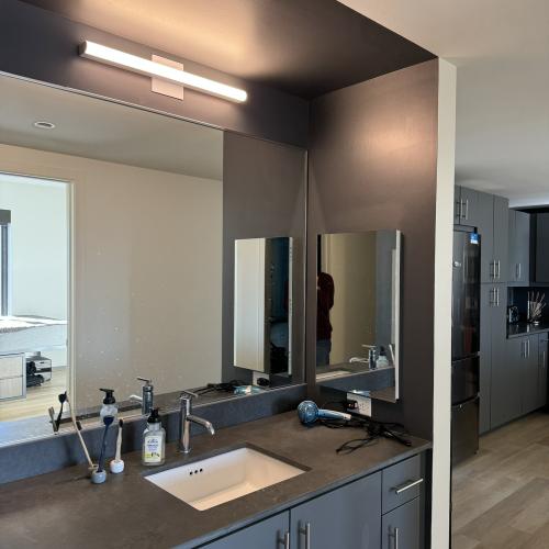 The bedroom is completely furnished with a full-XL bed+mattress, 4 drawers, a desk (with computer monitor) and desk chair, a bookshelf, and a built-in closet that comes with two large mirrors attached to their doors! The living room is also furnished, with a couch, coffee tables, entertainment stand and a 55-inch smart TV.