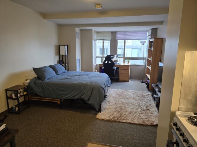 Hi there! This SidPac efficiency comes with a bunch of extra comforts that make it feel way more like a real home. The usual twin XL has been replaced with a comfy queen-size bed, and there’s a reading lamp right next to it for late-night work or relaxing. The unit also has a cute table for two, a monitor you’re welcome to use (the PC will be unplugged), and a proper gaming chair instead of the standard apartment one.